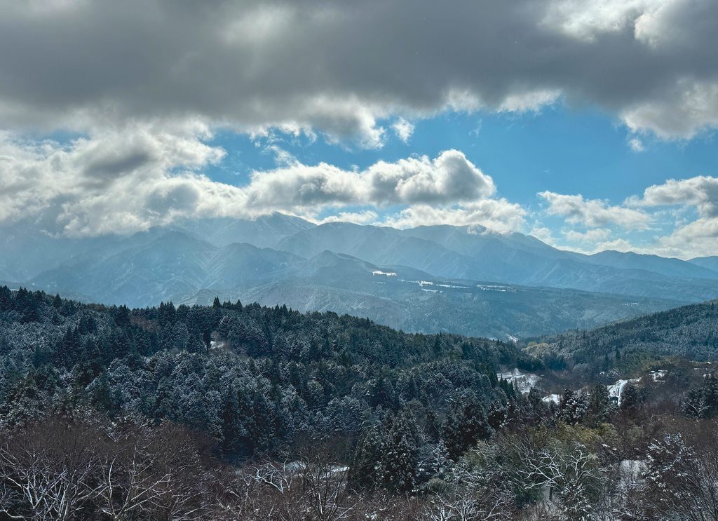 遠一點的山也被雪蓋住,天氣很冷但風景很清楚,剛好可以拍層層山巒。
